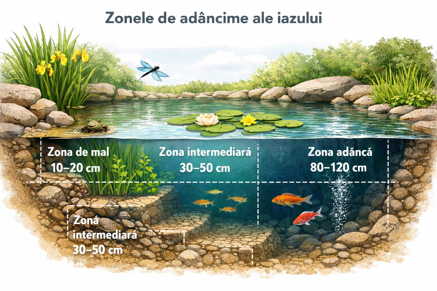 În climatele temperate, o adâncime de minimum 80–100 cm ajută iazul să nu înghețe complet iarna.